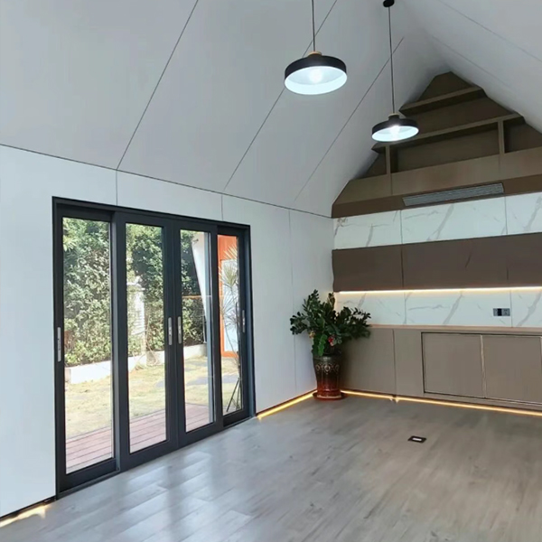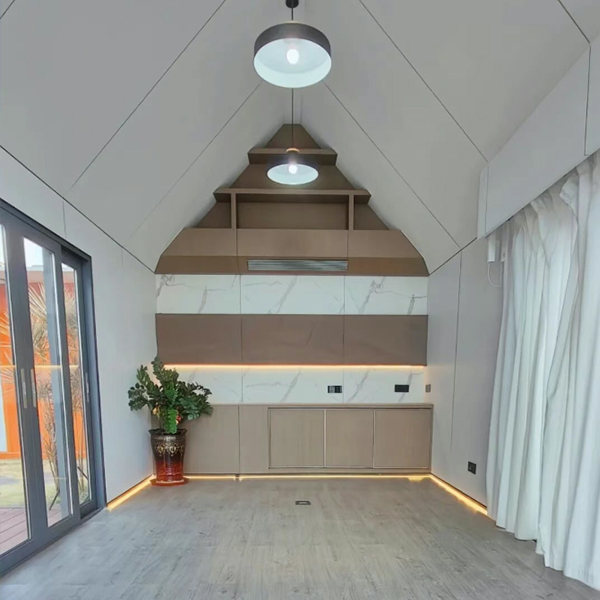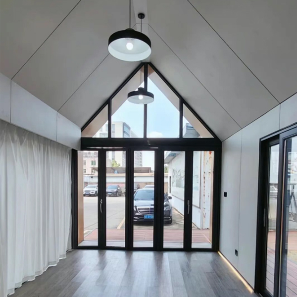 外型采用了原始三角屋的结构设计,墙板用黑灰色的铝镁锰板材质 轻质高强,耐候抗腐和可塑性强,最主要是美观又大气又不失优雅,正门高档全开折叠门可以全部打开,搭配铝框落地窗使得更加通透明亮。