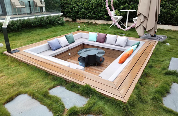 打破了传统户外家具 “悬浮” 于地面的疏离感,用一种 “下沉” 的姿态,可以把人稳稳 “揽” 进自然的怀抱。这样的设计可以轻松容纳多人,无论是家庭聚会,还是好友来访都是不错的聚会场所。