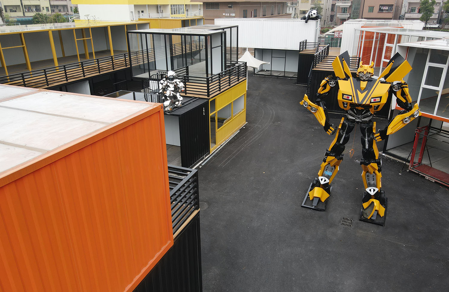 细节控一定要来打卡!集装箱自带的折叠窗,灵活切换成售卖窗口,逛起来超有氛围感;公共区域的艺术装置藏着超多惊喜,尤其是大黄蜂雕塑,妥妥的 C 位担当!不管是站在楼梯上仰拍,还是靠在玻璃墙侧拍,工业潮范大片随手拿捏,九宫格真的不够发!