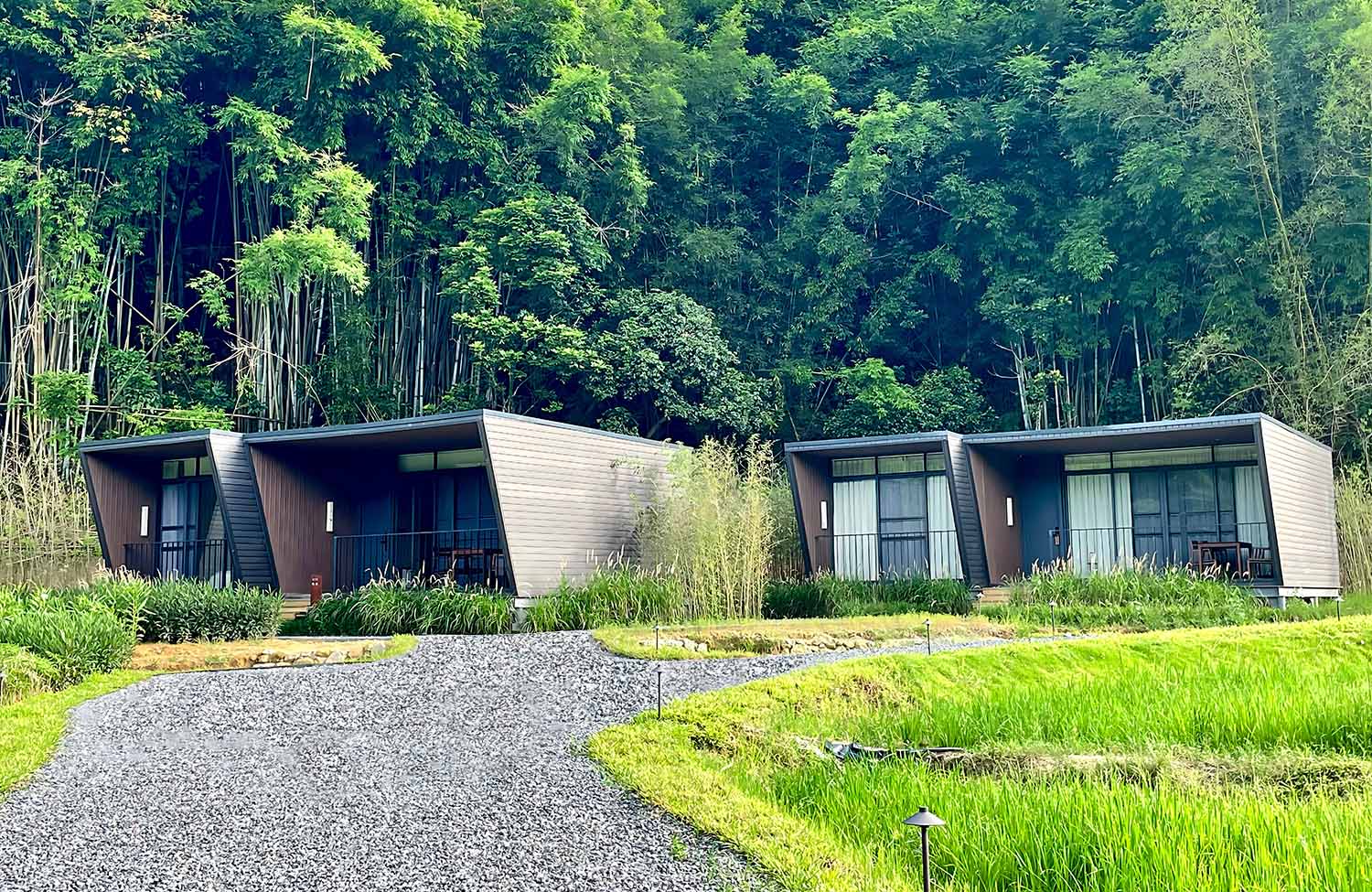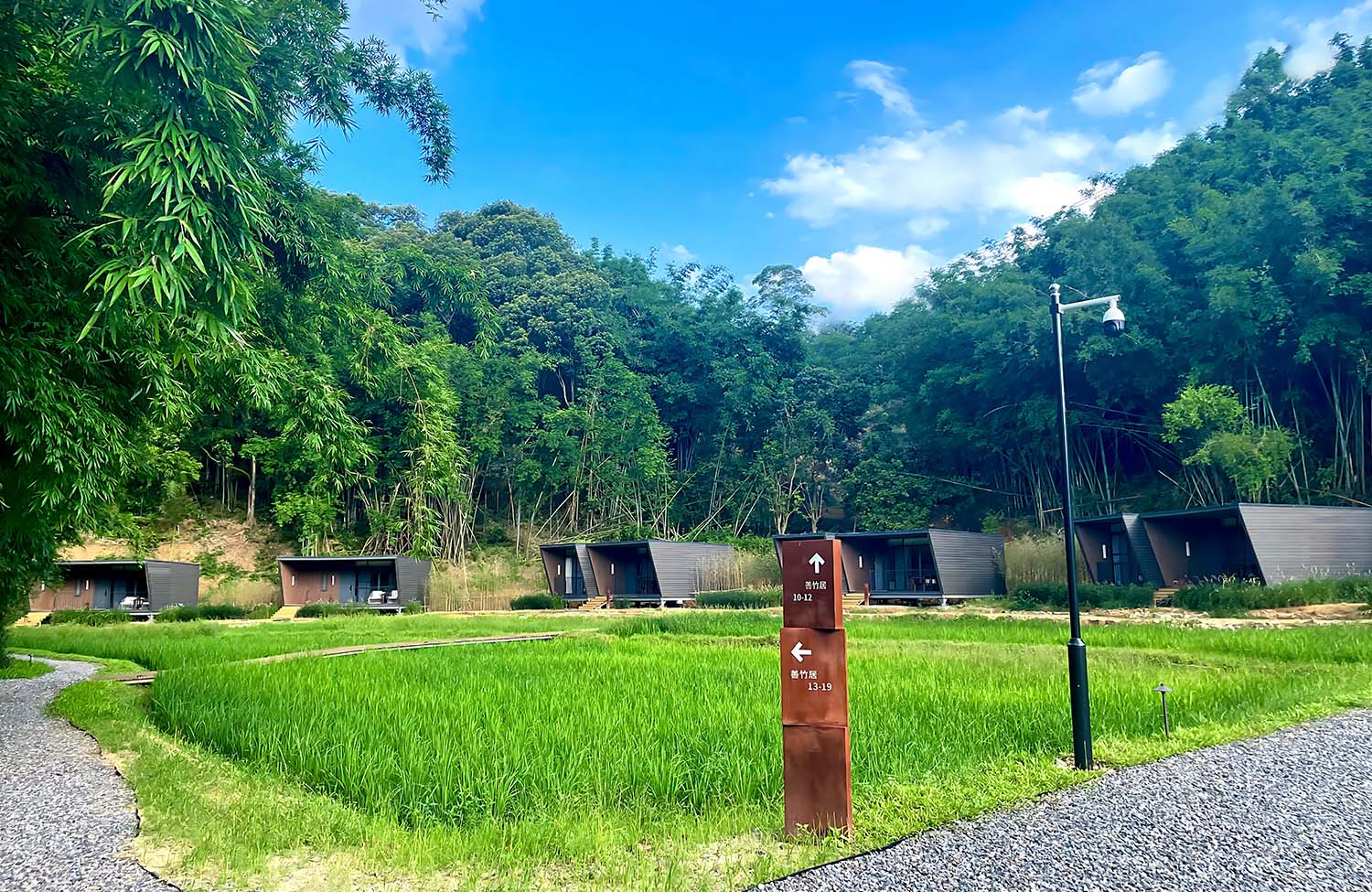 民宿被竹林和青山环绕,到处都是郁郁葱葱的绿色。沿着碎石小路散步,能看到集装箱小屋错落有致地分布在稻田旁,工业风的硬朗线条与自然的柔和绿意碰撞出独特的美感。