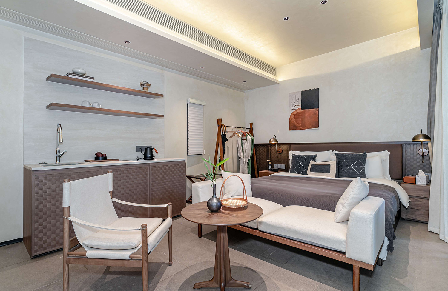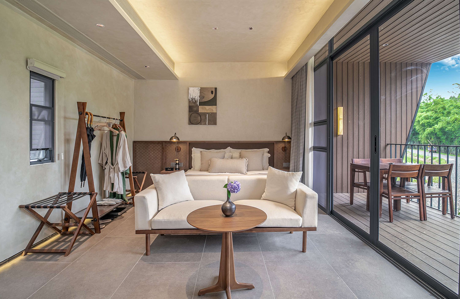 原木风 + 侘寂感的设计,暖黄的灯光一整个温馨住了。超大的床、柔软的沙发、开放式的空间,哪怕待在房间里一整天都不闷。每间房都配备观景阳台,摆上桌椅,泡一壶茶,看稻田随风起伏,这才是度假该有的样子!